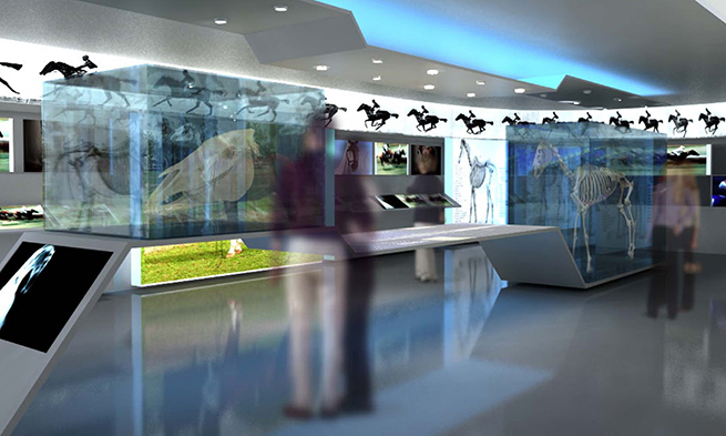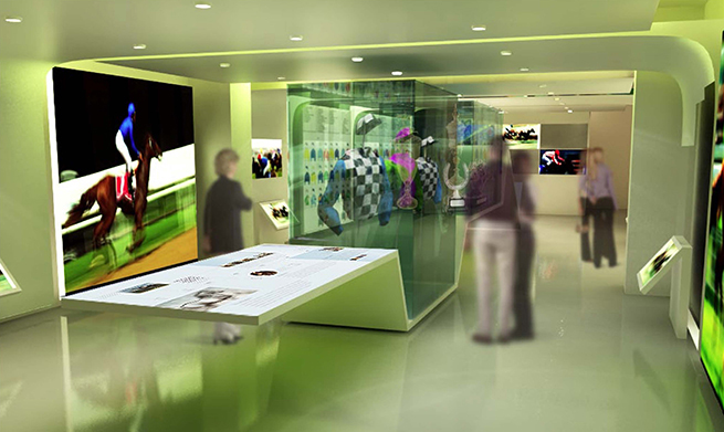 Electronic displays include an x-ray view of a horse’s anatomy; a Muybridge influenced digital animation showing horses in motion; moving images of classic races; and a simulated ride from a jockey’s perspective.