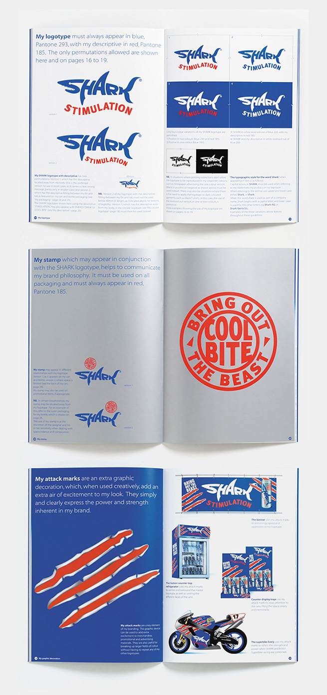 By using letterforms to create the Shark motif, the design could be adapted for different alphabets, including Chinese, Arabic and Cyrillic, as well as Latin script. The brand was able to capitalise on the market that had already been created for energy drinks, harnessing colours associated with energy and refreshment, while echoing shark-like hues of the sea.