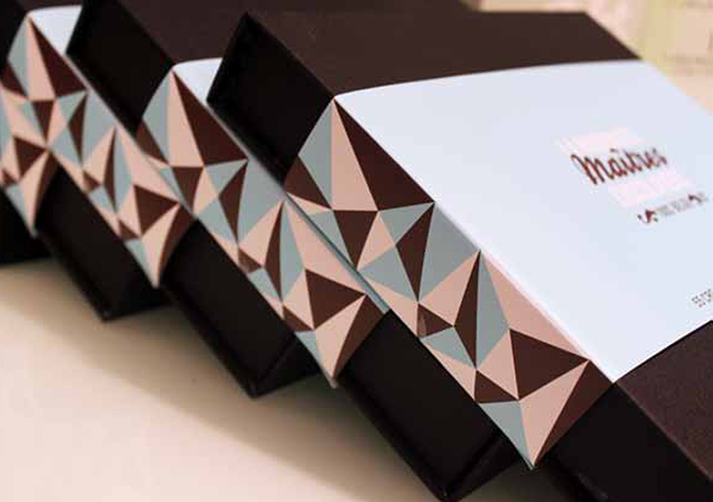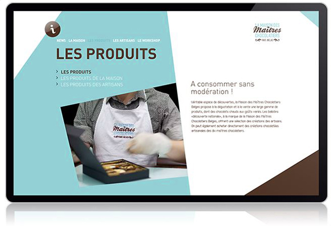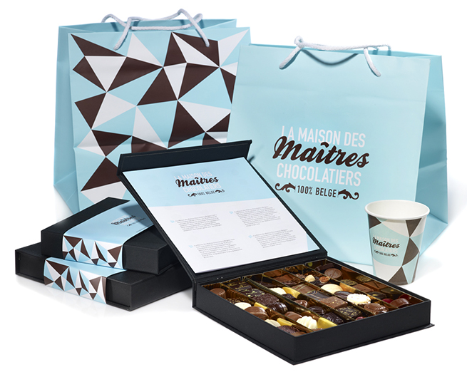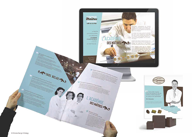 Il nome da noi creato, “La Maison des Maîtres Chocolatiers Belges”, è un nome importante per un concetto prestigioso. L’identità e gli elementi di design associati comunicano lusso e semplicità allo stesso tempo. La tavolozza di colori concentrata sull’azzurro, sul marrone e sul bianco ha un tocco leggero, mentre le forme geometriche hanno una loro complessità che suggerisce competenza e garanzia di risultati.