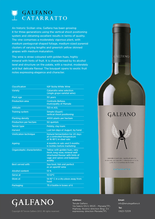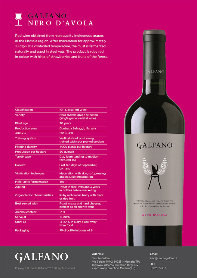 Nonostante le difficili condizioni di mercato in Italia, le vendite nel mercato interno sono stabili anche a fronte di un posizionamento più elevato, conseguenza del nuovo marchio. Galfano sta ottenendo buoni risultati nell’Italia meridionale, con una previsione di 100.000 bottiglie prodotte nel 2013 e un aumento del 100% nel 2014, quando la sua nuova rete di 15-20 rappresentanti inizierà le vendite nel Nord Italia.