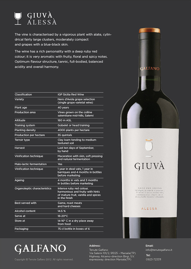 L’essenza del marchio Galfano è racchiusa nelle cesoie per la potatura delle vigne, usate per rappresentare la cura che la famiglia ripone nel territorio e nel vino che produce. Sono impiegati solo ingredienti naturali, senza fermenti o additivi artificiali, e i grappoli d’uva sono recisi a mano per evitare di danneggiare i vigneti. L’identità visiva e le etichette apposte sulle bottiglie erano l’inizio della creazione di questo piccolo ma autentico marchio che avrebbe portato all’attenzione generale la filosofia alla base del Galfano.