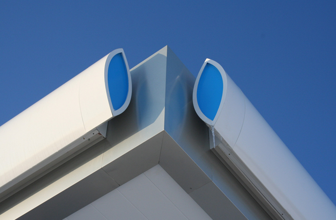 Per l’illuminazione della tettoia abbiamo raccomandato luci a LED, che durano una vita e si dimostrano più affidabili in condizioni di forte gelo. Il negozio è caratterizzato da un rivestimento in alluminio che segnala le offerte di prodotti alimentari su pannelli gialli, differenziandoli nettamente dai carburanti.
