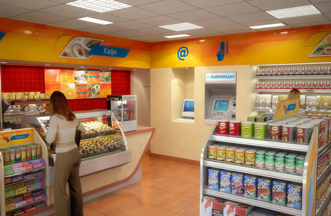 Dato che l’offerta di prodotti alimentari esercita una forte attrattiva sui clienti di una rivendita, è importante mantenerla distinta dall'offerta di carburante a livello visivo. Per il negozio sono state scelte delle accoglienti sfumature di arancione, che infondono la promessa di un ambiente caldo appena vengono viste dall’area di rifornimento. Il colore blu caratterizzante l’azienda è stato impiegato per la segnaletica interna e per il materiale per il wayfinding, mantenendo un collegamento visivo con il marchio Gazprom.