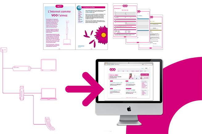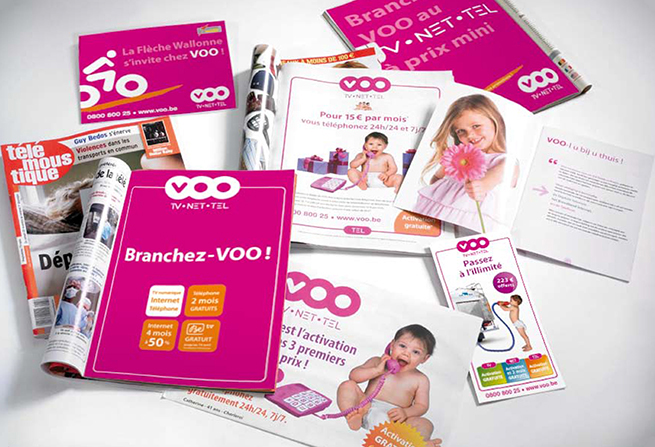 Nel corso dell’ultimo anno, è stato condotto un esteso programma di branding per comunicare l’impegno di Voo nel dare più controllo ai propri clienti. Il nome e il logotipo Voo sono diventati insieme un marchio facile da ricordare, il che ha contribuito sensibilmente al successo della nuova azienda. L’identità del marchio Voo agisce su tutti i tipi di pubblico ed è adatta ad ogni uso a prescindere dal tono richiesto, che sia serio oppure allegro.