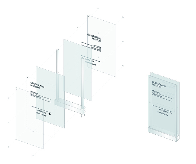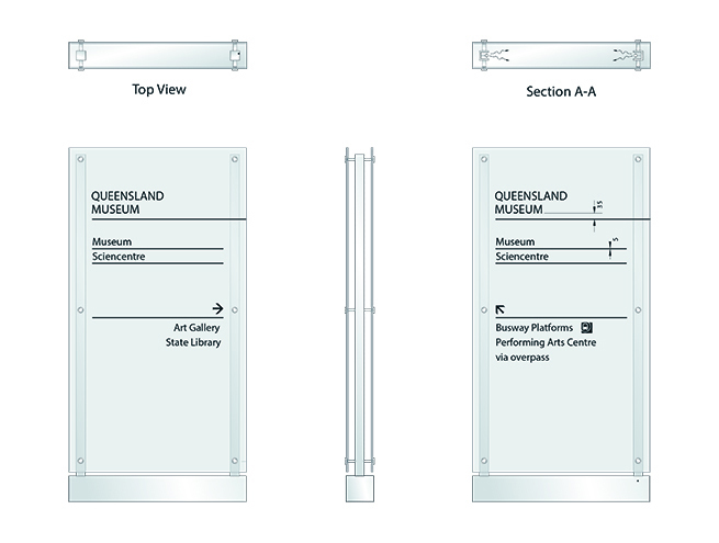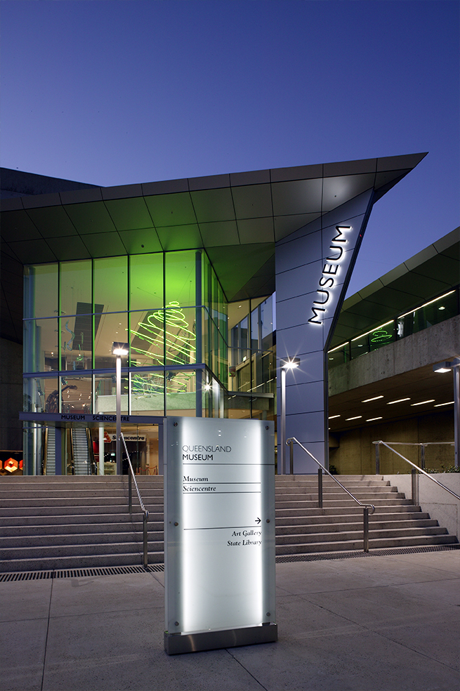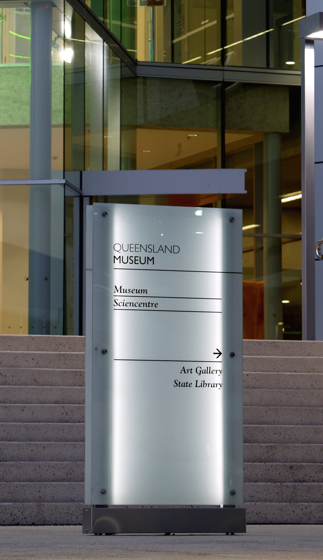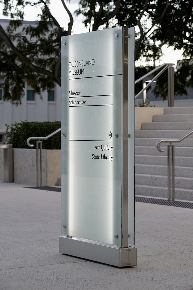 Located within the South Bank Cultural Precinct in South Brisbane, Queensland, Australia, we were commissioned to design a series of entrance and directional signs to lead people though the Queensland Museum plaza and entrance which was designed by Robin Gibson Architects.